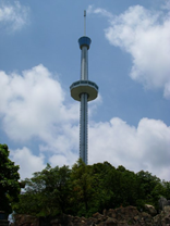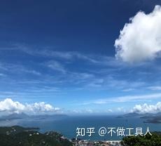 山顶风景很好,可以眺望大梅沙无边蔚蓝的大海,跟在大梅沙玩时对海的感受完全不一样,在那只觉得海水怎么这么脏,这么黄,但是在山顶看就是蔚蓝的大海。山顶有两个观光项目,自然之眼和云中漫步。自然之眼观光塔类似于摩天轮,有一个大圆盘缓慢升至顶部,边升边旋转,可以360°欣赏周边的山、海、别墅群和高尔夫草地。云中漫步观景带和登峰造极观景平台是架在山顶的玻璃走廊,可以在上面边看风景边吹风边看云霄飞轮。